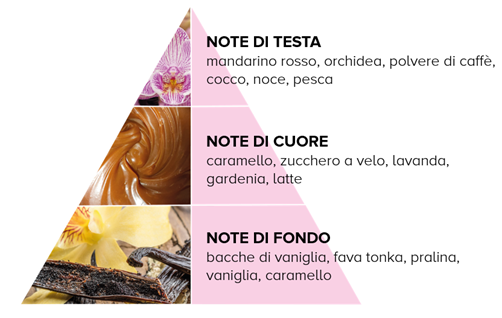 La sua inimitabile profumazione ha note dolci e irresistibili che la rendono golosa come il caramello, dolce come lo zucchero a velo e avvolgente come un caldo caffè latte alla vaniglia.